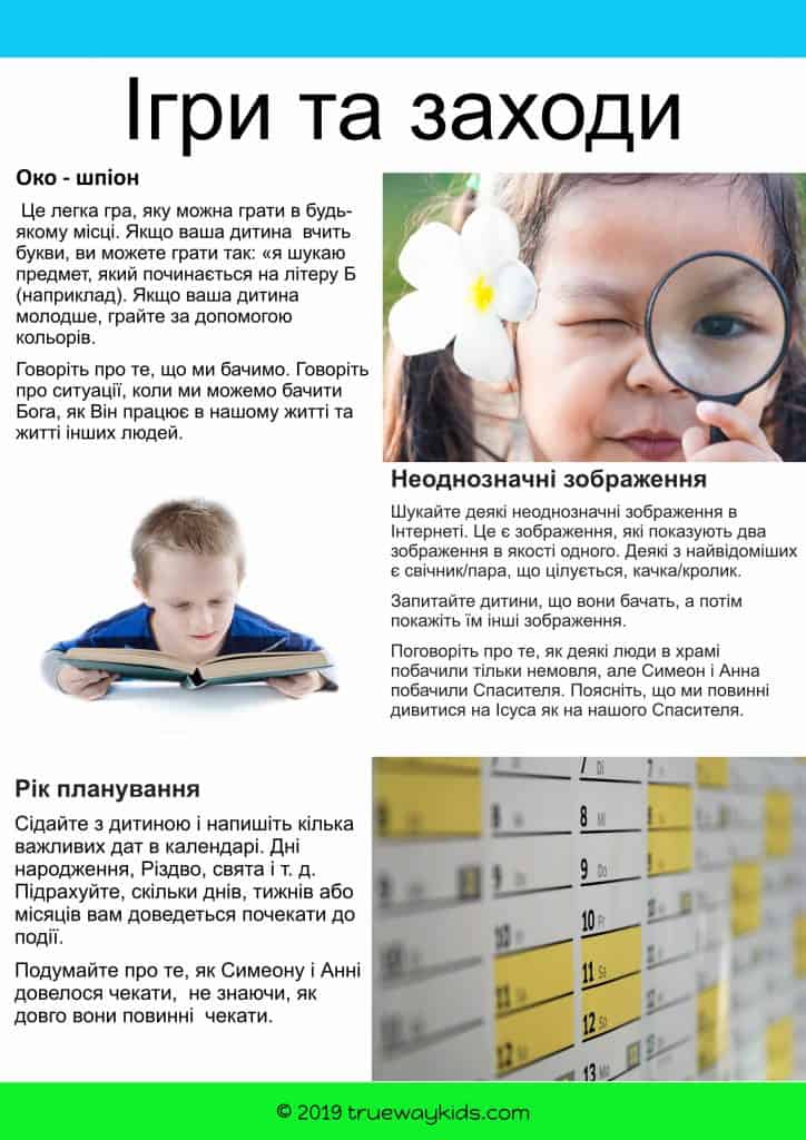 Подумайте про те, як Симеон і Анна відреагували на зустріч з Ісусом. Нагадайте дитині, що Ісус все ще хоче, щоб ми зустрілися з ним і визнали Його Спасителем.