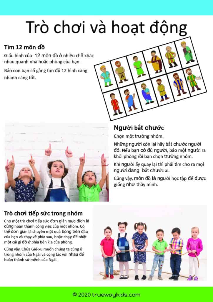 Giải thích rằng môn đồ là người đi theo. Những người này đi theo Chúa Giê-xu, học hỏi nơi Ngài và vâng lời Ngài. Mục tiêu của một môn đồ là trở nên giống như thầy mình. Cũng giống như chúng ta hay cố bắt chước các anh chị lớn tuổi hoặc một anh hùng siêu nhân nào đó trên TV vậy. Chúa Giê-xu ban quyền năng cho các môn đồ để thực hiện mạng lệnh của Ngài . Ngài đã ban cho họ những gì họ cần. Bạn có thể cho một trò chơi để minh họa điều này cho con bạn. Chọn một tin nhắn ngắn gọn và người mà chúng sẽ nhắn lại tin đó. Ngoài ra, tạo một không gian ở nhà thờ hoặc nhà bạn, và cần một vài đồ vật đặc biệt như giăng một sợi dây ngang qua lối đi nhỏ, có một hướng dẫn rằng phải cắt dây để vượt qua nó. Đặt một số bong bóng trên lối đi, với hướng dẫn là không được chạm vào nó. Tắt điện trong phòng để cho phòng tối