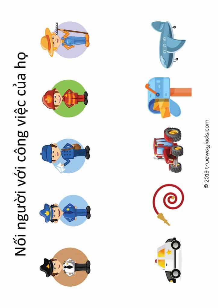 Nói về các công việc khác nhau trên thế giới. Bạn có thể tô màu trang mẫu, cắt ảnh từ tạp chí hoặc chỉ nói đến công việc thôi. Bảo bé giải thích công việc của mỗi người là gì. Nhân viên bồi bàn phục vụ đồ ăn. Một lính cứu hỏa dập lửa. Một cảnh sát bảo vệ mọi người… Bạn có thể hỏi bé muốn làm nghề gì, và nói về công việc bạn đang làm. Giải thích rằng Chúa Giê-xu đến thế gian để làm một công việc quan trọng. Ngài đến để giải cứu con người khỏi tội lỗi của họ.