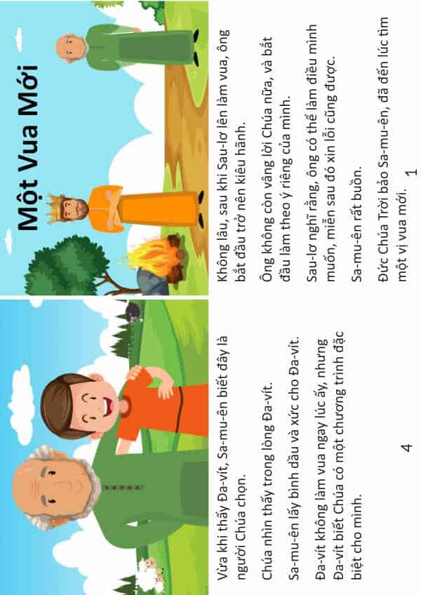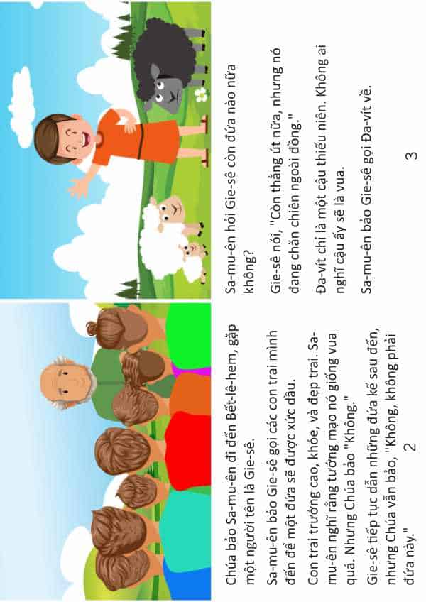 Đọc câu 6-11, kể về Sa-mu-ên đến nhà của Gie-sê. Giải thích là Gie-sê cho gọi tất cả con trai của mình về, và hầu như quên mất Đa-vít, vì cậu ta đang chăn chiên ngoài đồng. Hỏi xem bé có nghĩ rằng một cậu bé chăn chiên sẽ trở thành một vị vua tốt không?