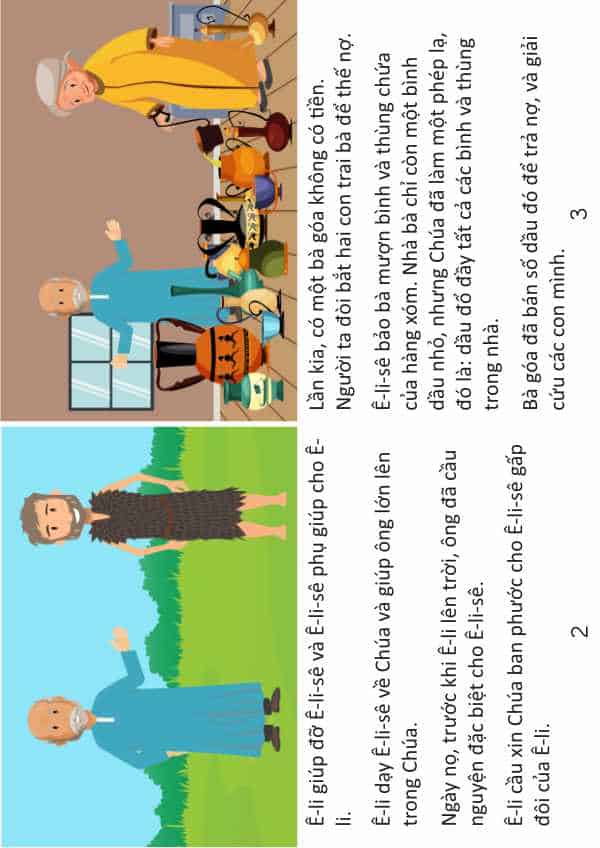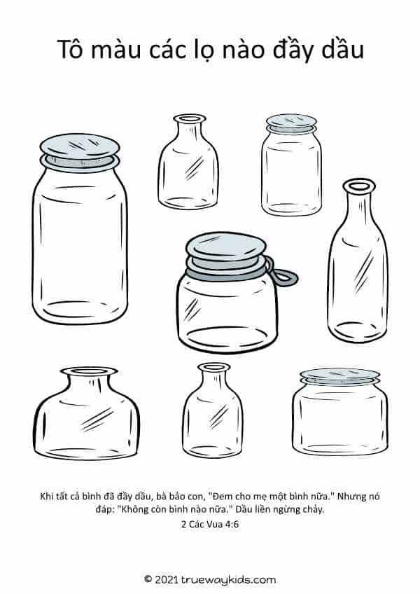 Đọc câu chuyện về Ê-li-sê và bình dầu của bà góa trong 2 Các Vua 4:1-7. Thoa một ít dầu ô-liu vào tay bé để bé cảm nhận và ngửi. Giải thích dầu rất quý giá trong thời Kinh Thánh. Gom các lọ nhỏ trong nhà bạn và một bình nước. Hãy đoán xem bạn có thể rót đầy được bao nhiêu lọ trước khi bình hết sạch nước. Giúp bé đổ đầy các lọ. Giải thích Chúa đã làm một phép lạ bằng cách không để cho dầu của bà góa hết cạn trong bình.
