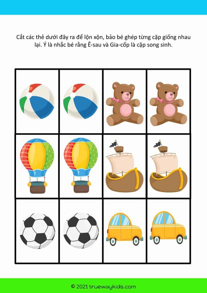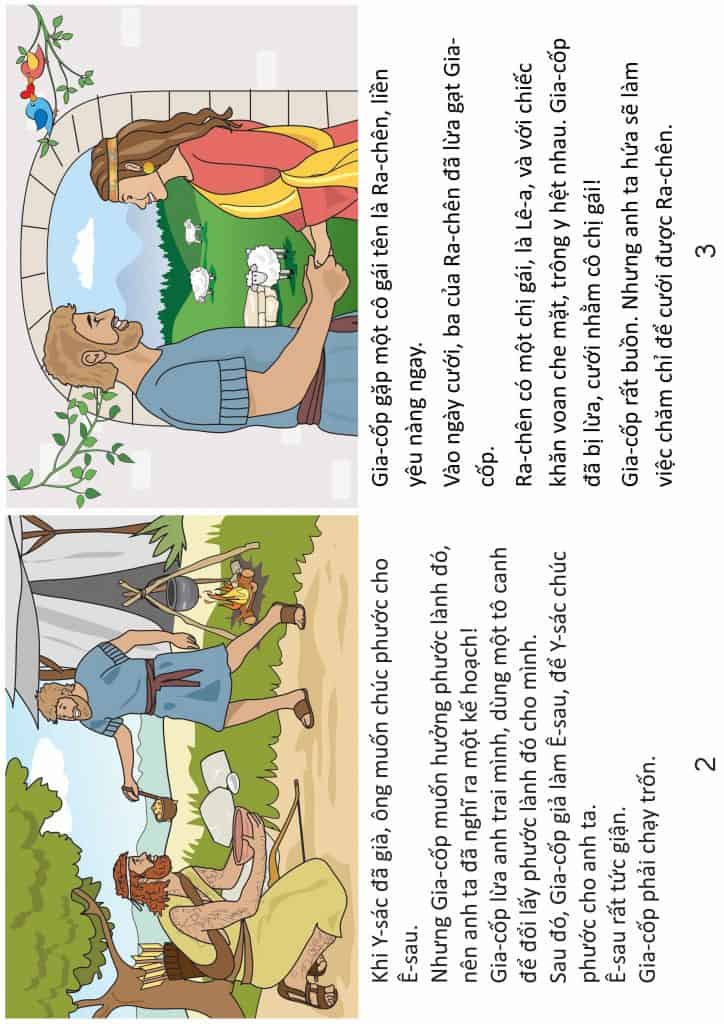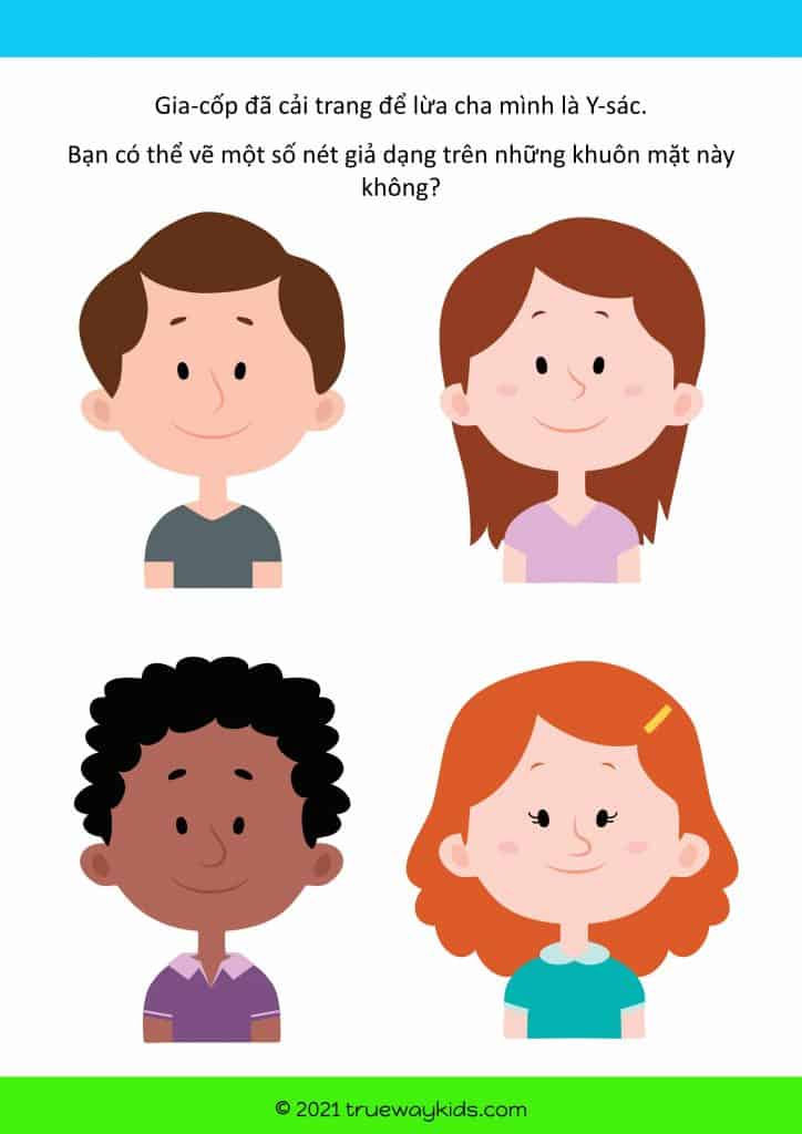 Gia-cốp lừa cha mình bằng cách giả làm anh trai của mình. Hỏi bé xem Gia-cốp có đúng không khi lừa anh trai mình và nói dối cha mình. Đọc Lu-ca 6:31. Giải thích rằng chúng ta bị tổn thương khi mọi người làm điều xấu với chúng ta, vì vậy chúng ta không nên làm điều xấu cho người khác. Đức Chúa Trời dạy chúng ta không được nói dối.