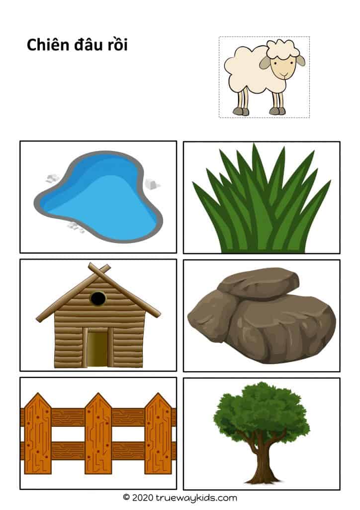In trang có những tấm thẻ trong bài học. Đặt các mặt thẻ úp lên bàn, trong đó có một thẻ có hình con chiên. Lần lượt từng em đoán và tìm thẻ có hình con chiên. Em nào tìm ra trước sẽ tiếp tục giấu thẻ cho lượt chơi kế tiếp.