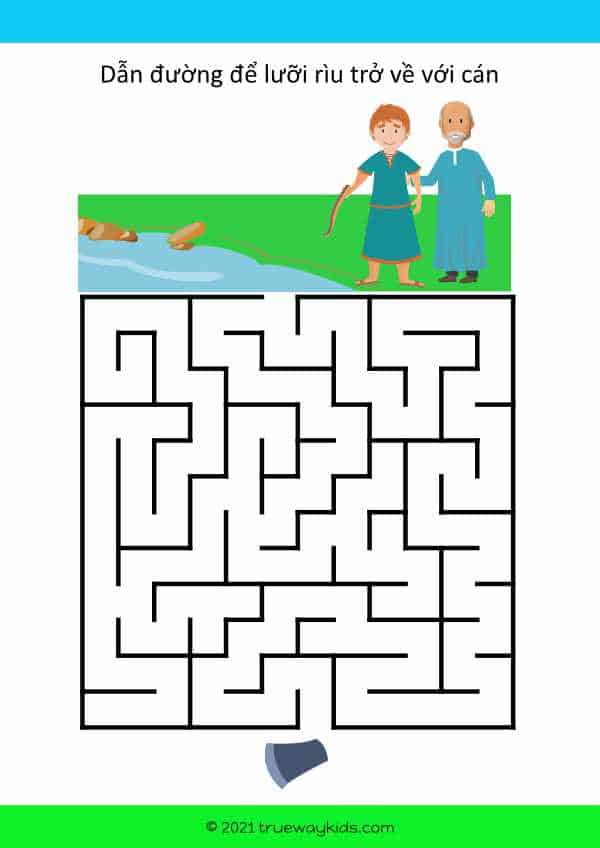 Khi lưỡi rìu rớt xuống nước, người này xin giúp đỡ. Nhắc bé rằng, nài xin Chúa giúp, và nhờ người khác giúp luôn luôn là tốt. Một cái lưỡi rìu thì rất nặng. Đổ đầy nước vào cái thau. Dùng một viên đá hoặc vật nặng khác thế cho lưỡi rìu, thả nó vào thau. Đưa cho bé một que cây và bảo bé ném nó xuống nước. Hỏi bé xem, que cây có làm cho đá nổi lên không. Thật kinh ngạc trước phép lạ của Chúa, làm lưỡi rìu nổi lên cho Ê-li-sê.
