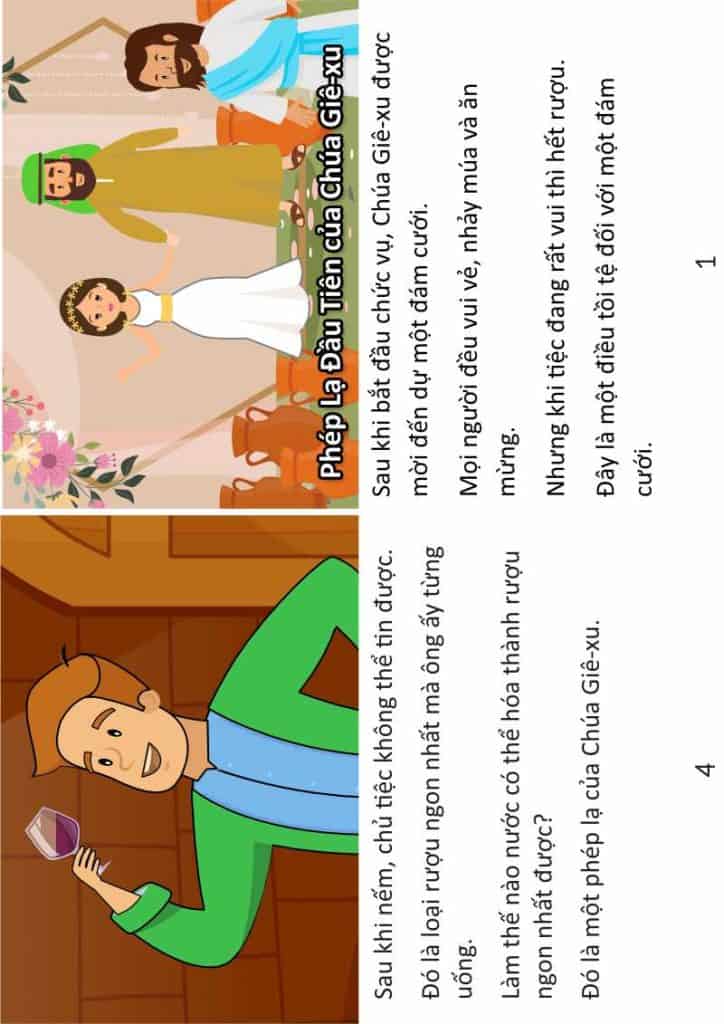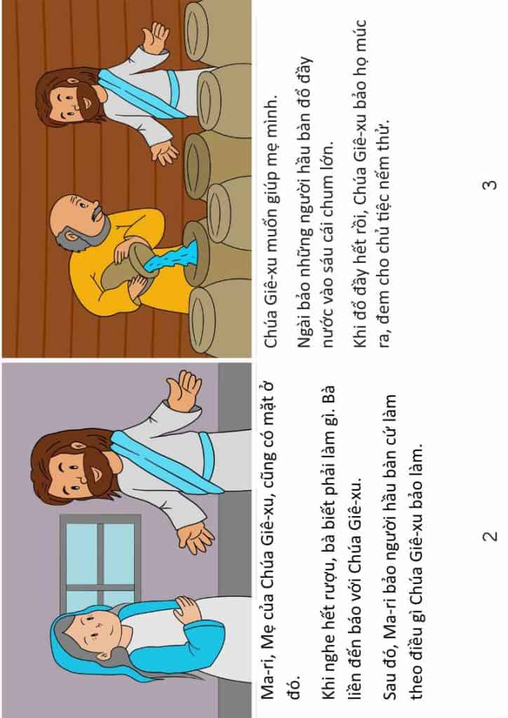Hỏi bé phép lạ là gì. Giải thích rằng, phép lạ là một việc không thể giải thích bằng các phương tiện bình thường, nhưng là do Chúa làm. Chúa Giê-xu hóa nước thành rượu. Hỏi bé đây có phải là phép lạ không? Bạn có thể liệt kê một số việc, và hỏi bé có phải là phép lạ không.