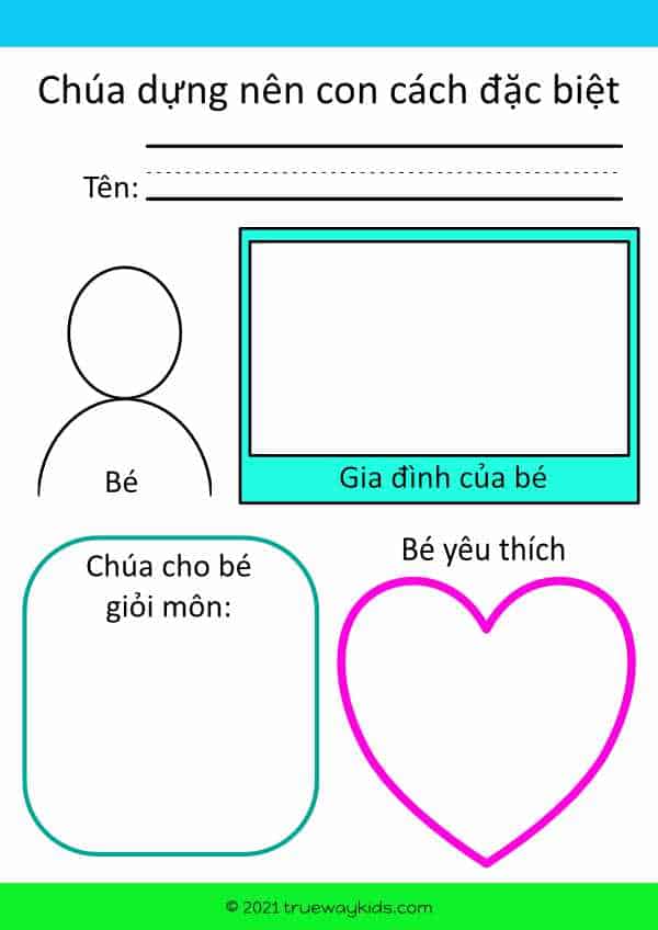 Nhắc bé rằng Đức Chúa Trời đã làm cho bé nên đặc biệt, và Ngài không muốn bé giống như mọi người khác. Nói về ân tứ và khả năng mà Đức Chúa Trời ban cho bạn và cho bé. Chính những điều này làm cho bé trở nên độc đáo, và bé có thể sử dụng những khả năng này để phục vụ Chúa.